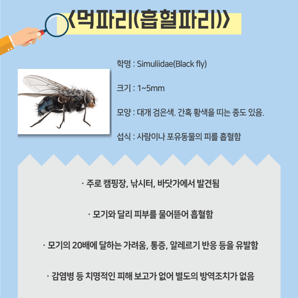 주로 캠핑장, 낚시터, 바닷가 등에서 먹파리 피해 사례가 보고되고 있습니다.