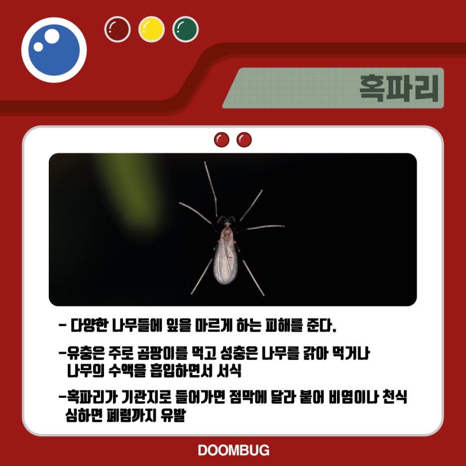 혹파리가 기관지로 들어가면 점막에 달라붙어 비염이나 천식을 유발하며, 심하면 폐렴까지 유발하는 위험한 해충입니다.